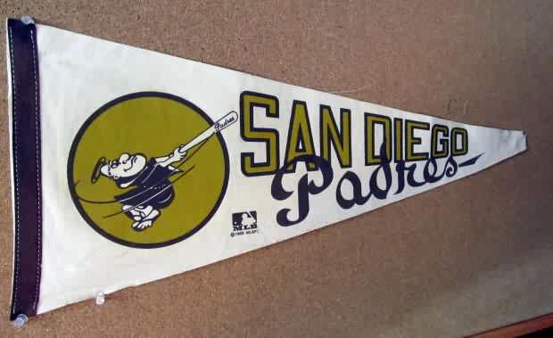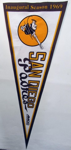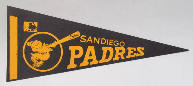 pennant. SAN DIEGO PADRES. gold and brown on white with brown border. tip is missing the last inch or so.. has the Swinging Padre logo. dated 1969 MLPBC logo. First Year. edge stains. full size approx. 30" long. early and scarce. 15.00