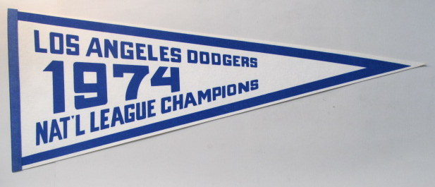 pennant. 1974 LOS ANGELES DODGERS NAT'L LEAGUE CHAMPIONS. dark blue on white. dark blue border. tip intact. standard size approx. 29.5" long. near mint to mint. 45.00
