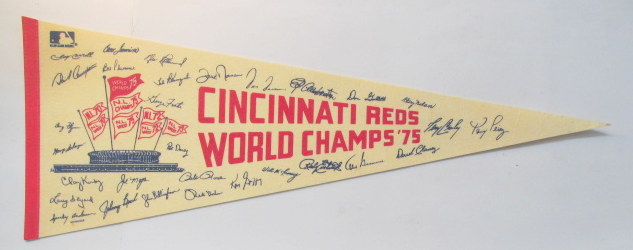pennant. 1975 CINCINNATI REDS WORLD CHAMPS '75. red and blue on off white. red border. stiff material. tip intact. graphics of the stadium with all the championship flags flying above it. facsimile signatures of the players. slightly yellowed. excellent or nicer. uncommon. 59.50