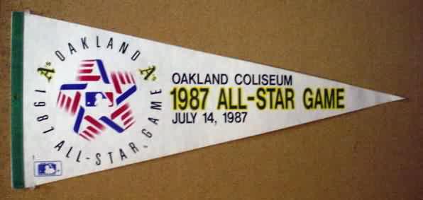 pennant. 1987 ALL STAR GAME - OAKLAND COLISEUM. green/yellow/red/blue/black on white. green border. tip intact. approx. 30" long. tiny pinholes in corners. hole punched on border - as issued. excellent to near mint. 20.00