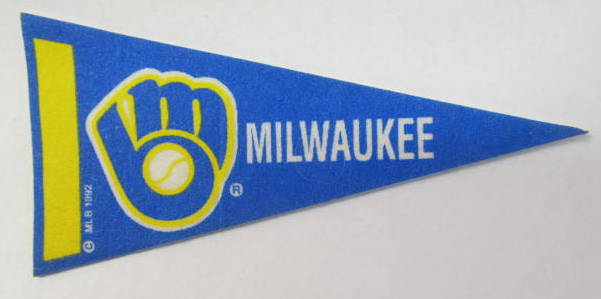 pennant. MILWAUKEE BREWERS. approx. 4.5" long miniature. dated 1992. colorful logo on front. reverse side is white. near mint to mint. 6.00