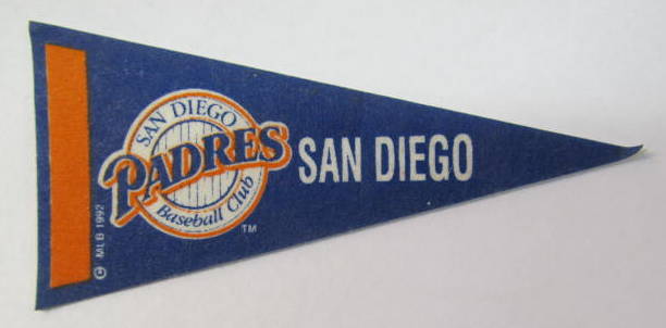 pennant. SAN DIEGO PADRES. approx. 4.5" long miniature. dated 1992. colorful logo on front. reverse side is white. near mint to mint. 6.00