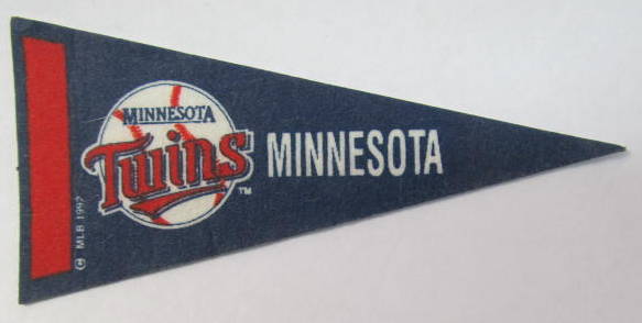 pennant. MINNESOTA TWINS. approx. 4.5" long miniature. dated 1992. colorful logo on front. reverse side is white. near mint to mint. 6.00