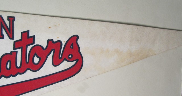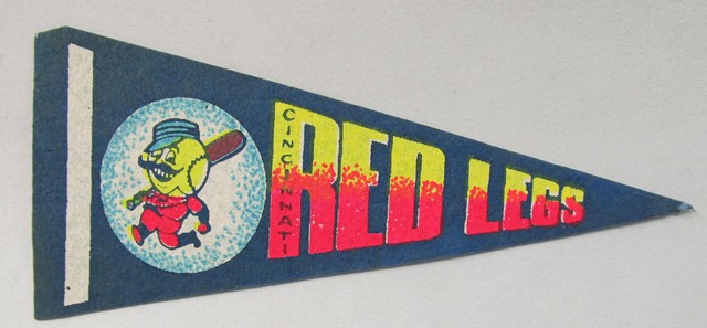 pennant. CINCINNATI RED LEGS. neon colors on dark bluish green. circa 1962. small 8.5" long. tip intact. top corner clipped. excellent. scarce. 21.50