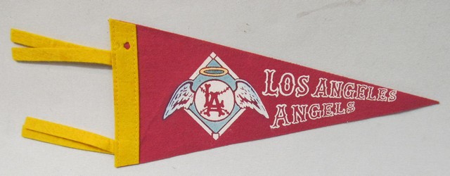 pennant. LOS ANGELES ANGELS. white lettering on red with golden yellow border and tassels. color logo. small 9" size. minor moth damage to border. tip intact. 1960's. near mint. 14.00