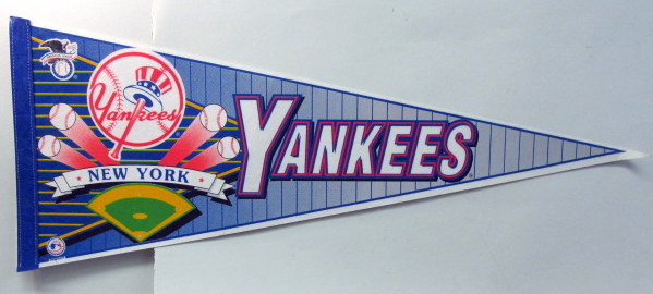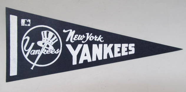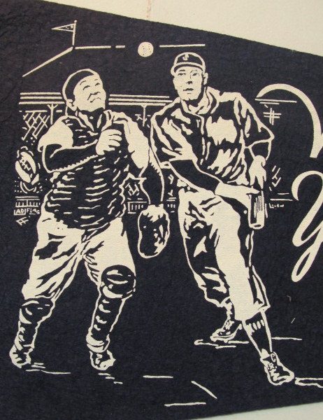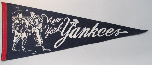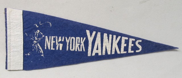 pennant. NEW YORK YANKEES. white on dark blue soft felt. white border. tip intact. illustration of a batter. small 9" size. early 1950's vintage. near mint. 24.00