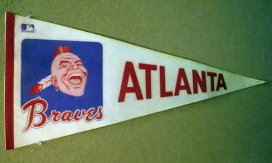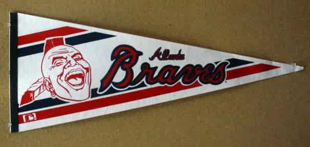 pennant. ATLANTA BRAVES. red and blue on white. red border. tip intact. stiffer material. circa early 1970's. approx. 29" long. tiny pinholes in corners. very good or nicer. 15.00