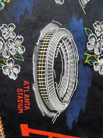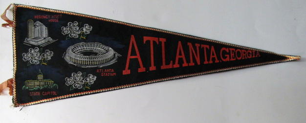 pennant. ATLANTA GEORGIA. dark red lettering on black. has great illustration of ATLANTA STADIUM; Regency Hyatt House; State Capitol. illustrations are raised and metallic glitter. edge is multicolored threading. very interesting and unique design. pre 1976 (when the stadium was renamed Fulton County Stadium). circa late 1960's. 26.5" long. tip intact. excellent plus or nicer. 35.00