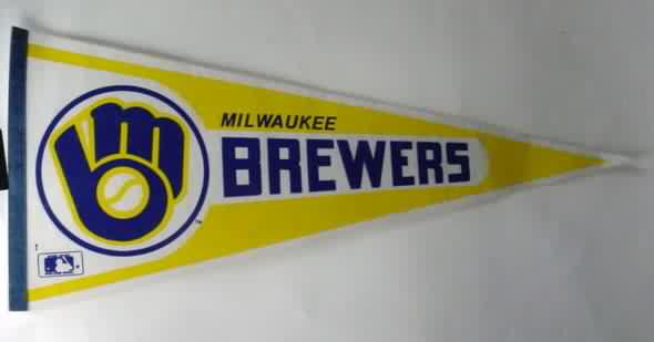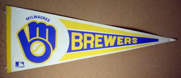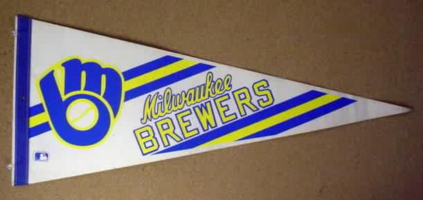 pennant. MILWAUKEE BREWERS. note that MILWAUKEE is above Brewers. dark blue, golden yellow on white. a lot of yellow. blue border. 1980's vintage. tip intact. minor pin holes. 30" long. near mint. 14.50