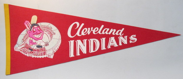 pennant. CLEVELAND INDIANS. white lettering on red felt. golden yellow border. large graphics of Chief Wahoo standing in center of stadium holding a bat to shoulder. tip intact. 1950's vintage. standard size approx. 29.5" long. tack holes in corners. colors are bright and vivid. excellent plus or nicer. 95.00