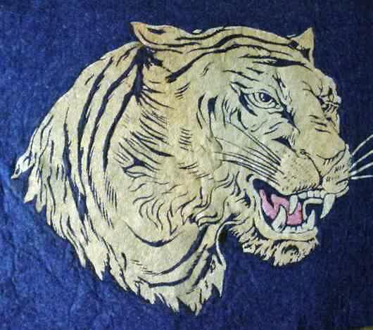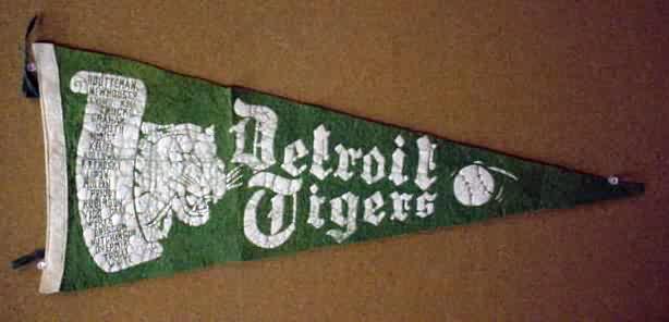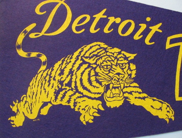 pennant. DETROIT MICH. white letters on blue soft felt. golden yellow border with matching tassels. close-up portrait of the TIGER logo. 1930's vintage. 27" long. colors are strong. minor age soiling along the border and tassels. excellent or better. different style. interesting. 70.00