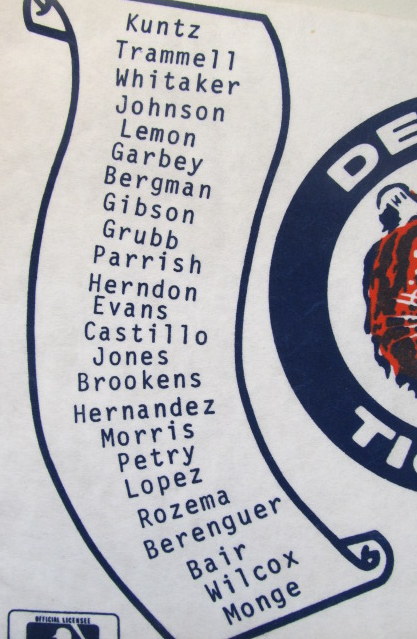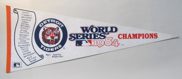 pennant. DETROIT TIGERS 1984 WORLD SERIES CHAMPIONS. orange and dark blue on white stiffer material. orange border. has scroll with team roster: Kuntz; Trammell; Whitaker; Lemon; Gibson; et al. standard size approx. 29.5". near mint to mint. 39.50
