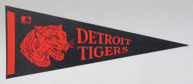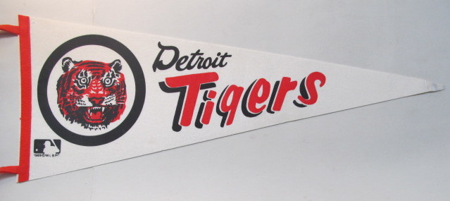 pennant. DETROIT TIGERS. orange and black on white felt. orange border with matching tassels. tip squared off. has the dated 1969 MLBP logo. standard size. approx. 29" long. excellent. 32.50