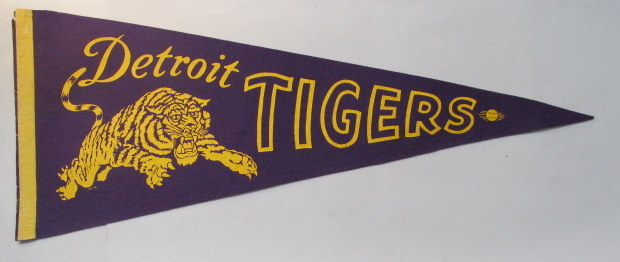 pennant. DETROIT TIGERS. golden yellow on dark purple soft felt. yellow border. tip intact. large illustration of pouncing tiger. small illustration of a baseball at far right. tip intact. late 1940's to 1950's vintage. standard size approx. 29.5" long. faint discoloration in upper section of the border. overall near mint plus. scarce. 99.50