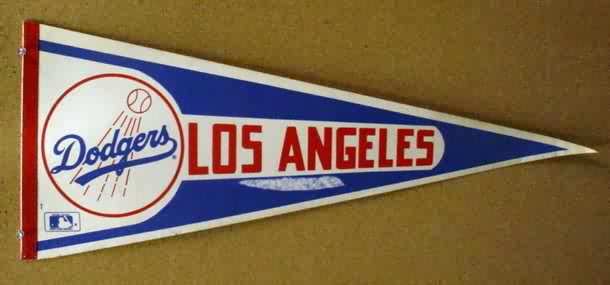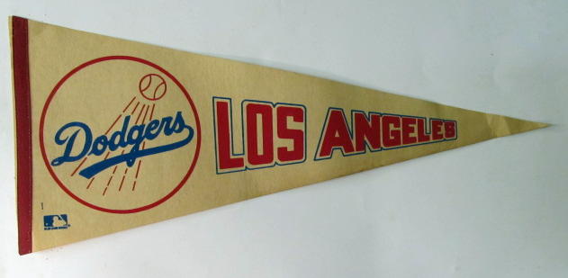 pennant. LOS ANGELES DODGERS. blue and red on white with red border and tassels. tip damaged. dated 1970 MLBPC logo. full size approx. 30" long. displays nicely. 14.00