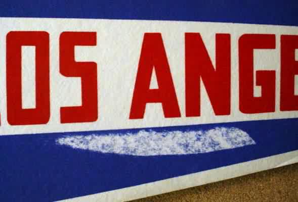 pennant. LOS ANGELES DODGERS. blue and red on white stiffer felt. red border. 30" long. 1970's vintage. pinholes. minor color bleed around the red printing. otherwise excellent plus. 15.00