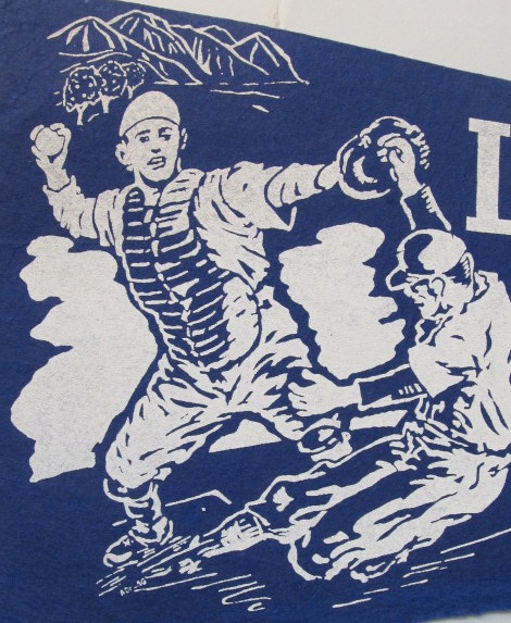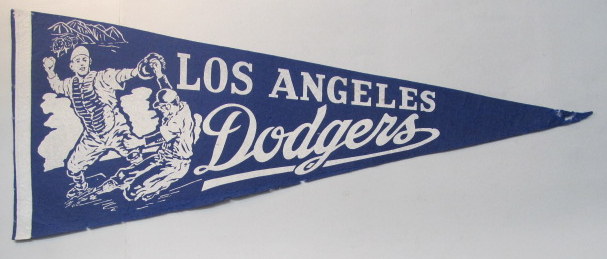 pennant. LOS ANGELES DODGERS. white lettering on soft blue felt. white border. great graphics of playing sliding into home as catcher is about to throw ball. late 1950's. minor moth damage with severe moth damage to tip. colors are strong and vivid. standard size approx. 29.5". still displays very nicely. 65.00