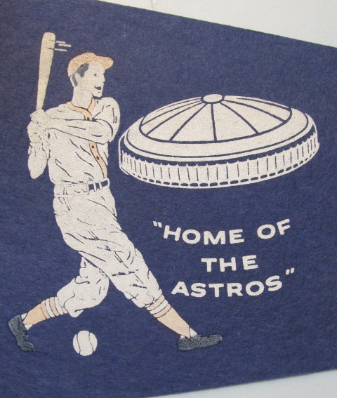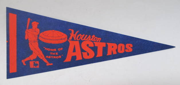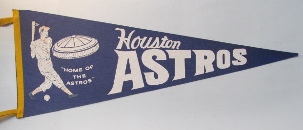 pennant. HOUSTON ASTROS - HOME OF THE ASTROS. white lettering on soft blue felt. golden border with matching tassels. large illustration of batter with Astrodome in background. circa 1965 when they switched their name from the Colt 45s. colors have slightly faded. pinholes in corner. very tip of the point squared off. very good or nicer. 39.50