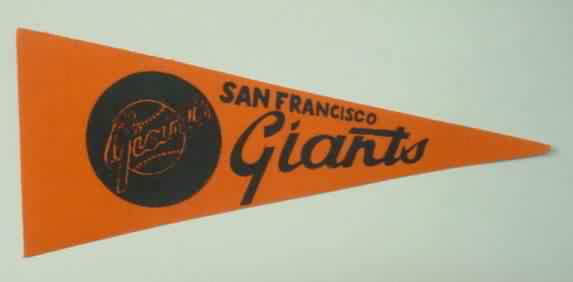 pennant. SAN FRANCISCO GIANTS. black on orange soft flannel. has team logo. 1960's vintage. smaller size approx. 8.75" long. near mint to mint. sorry sold