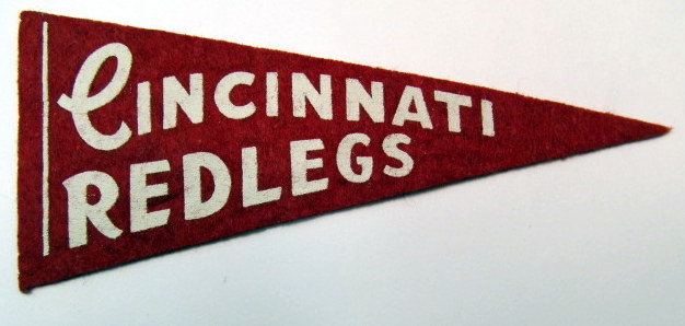 pennant. CINCINNATI REDLEGS. white on dark red soft felt. miniature only 5.75" long. 1930's to 1940's vintage. possibly a candy premium similar to a BF3. no flaws. excellent to near mint. 24.00