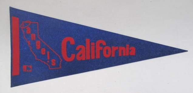 pennant. CALIFORNIA ANGELS. red and blue on white. red border. tip intact. stiffer material. circa early 1970's. approx. 29" long. tiny pinholes in corners. very good or nicer. 15.00