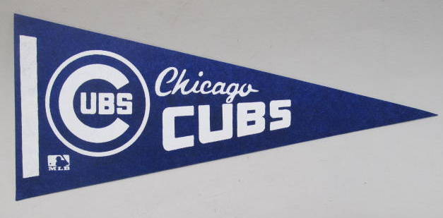 pennant. CHICAGO CUBS. white on dark blue. printed wide border. stiffer felt material. MLB LOGO issued circa 1977. approx. 12" long. unused MINT condition. 14.00