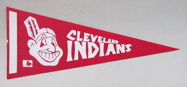 pennant. CLEVELAND INDIANS. white on red. printed wide border. stiffer felt material. MLB LOGO issued circa 1977. approx. 12" long. unused MINT condition. 14.00