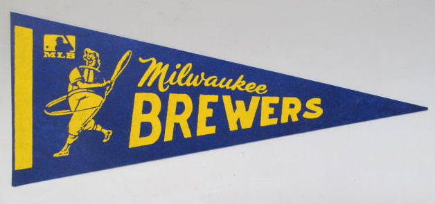 pennant. MILWAUKEE BREWERS. dark golden yellow and blue on white (diagonal stripes in background). team logo with blue & yellow diagonal stripes. undated, issued 1970's vintage. stiffer material. just shy of 30" long. has hole punched in center of border strip - as issued. minor wear to tip. light age soiling. unused. near mint. 16.00