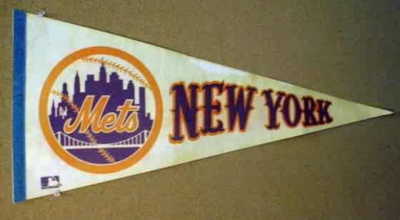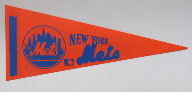 pennant. NEW YORK METS. orange and blue on white. blue border. tip intact. stiffer material. circa early 1970's. approx. 29" long. pinholes in corners. yellowed. very good. 14.50