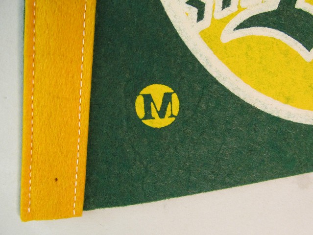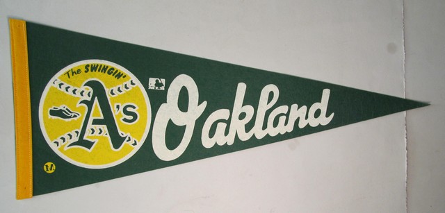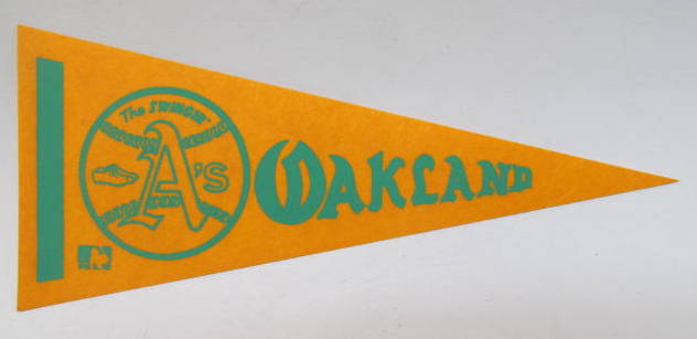 pennant. OAKLAND "The Swingin'" A's. white and yellow on green. golden yellow border. has unusual "M" baseball logo in lower left. tip intact. 1970's vintage. approx. 29.5" long. near mint to mint. 24.00