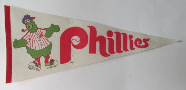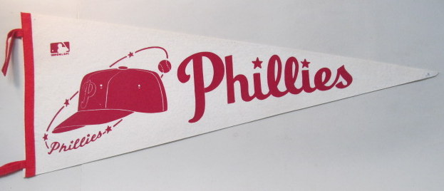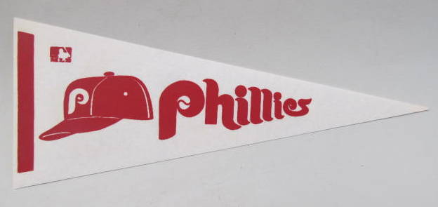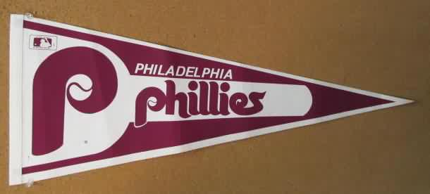 pennant. PHILADELPHIA PHILLIES. maroon and white. white border. tip intact. has the oblong MLBBP logo in upper left. 1970's vintage. 29.5". excellent plus to near mint. 18.50