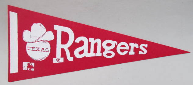 pennant. TEXAS RANGERS. white on red. printed wide border. stiffer felt material. MLB LOGO issued circa 1977. approx. 12" long. unused MINT condition. 14.00