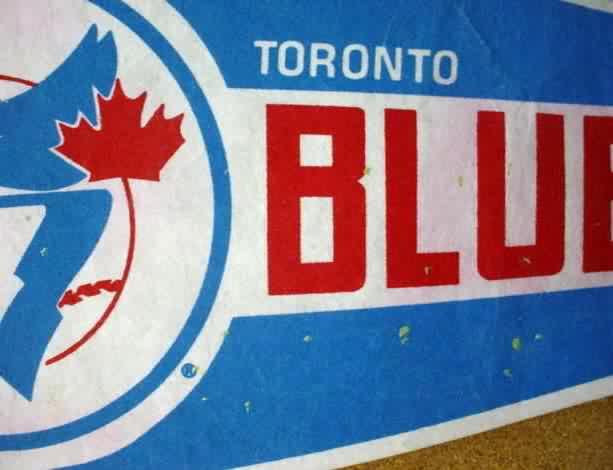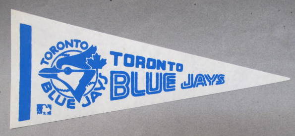 pennant. TORONTO BLUE JAYS. red and blue on white. red border. tip intact. large logo. tiny pinholes in corners. as issued with hole punch in border. standard size approx. 30". 1980's. excellent plus. 16.00