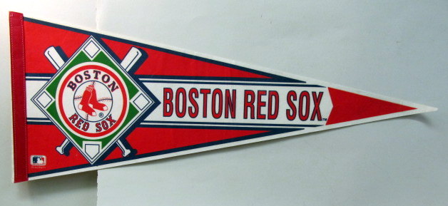pennant. BOSTON RED SOX. soft material. multicolored. red border. full size. Made by Wincraft. 1990's vintage. has RED SOX logo inside baseball diamond with crossed bats behind. excellent to near mint. 16.00