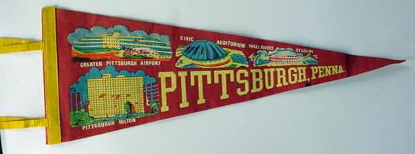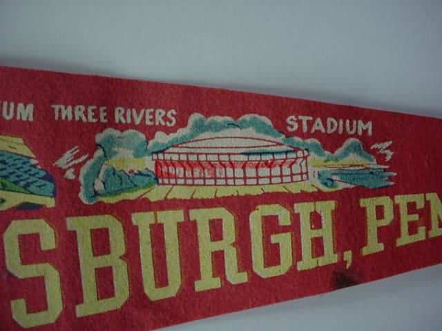 pennant. c.1970 PITTSBURGH THREE RIVERS Stadium pennant. 8 7/8" wide by 27 5/8" long - not counting the ties. Pink felt pennant; yellow lettering reads PITTSBURGH; PENNA. Has full color illustrations of Pittsburgh Airport; Pittsburgh Hilton; Civic Auditorium and THREE RIVERS STADIUM (which was recently torn down). The stadium was home to the PIRATES and the STEELERS. Yellow border strip with all 4 yellow ties intact. Minor stain under the "H" in Pittsburgh. excellent. 29.50