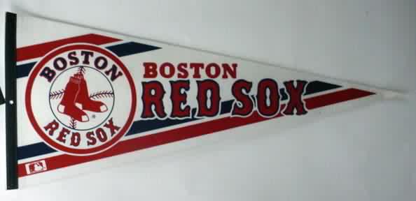 pennant. BOSTON RED SOX. red and black on white. stripes in background. Black border. border is hole punched; as issued. tip is intact. 1980's vintage. minor tack holes.29.5" long. colors are bright and vivid. near mint. 15.00