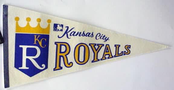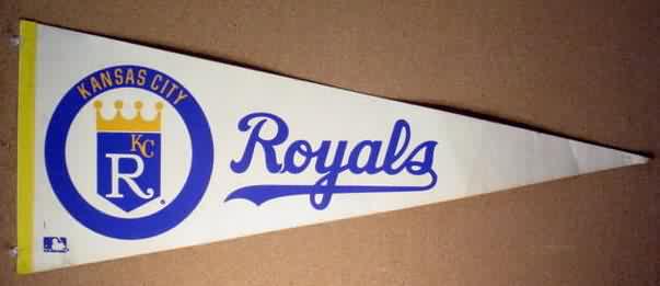 pennant. KANSAS CITY ROYALS. blue and yellow on white. blue border strip. tip intact but has tack hole. has the dated 1969 MLB logo. blue felt border strip is lightly faded. 30" long. excellent. 25.00