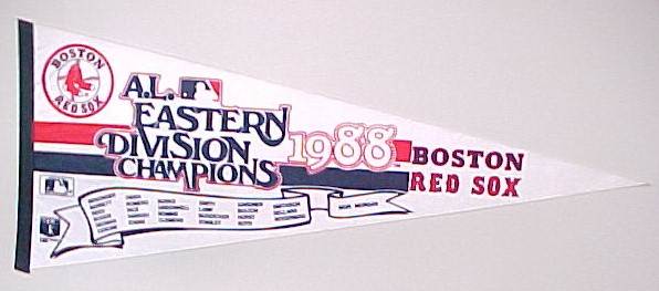 1988 RED SOX A.L. East Champions pennant. 12" wide by 29.75" long. Red & dark blue lettering on white. Has the BOSTON RED SOX logo in upper left. Reads A.L. EASTERN DIVISION CHAMPIONS, 1988, BOSTON RED SOX. Below is furled banner with team roster, includes: Benzinger, Barrett, Reed, Boggs, Gedman, Cerone, Owen, Romero, Rice, Parrish, Evans, Burks, Greenwell, Romine, Clemens, Smith, Lamp, Boddicker, Stanley, Gardner, Bolton, Hurst, Boyd, Smithson, Sellars, Woodward, Mgr. Morgan. Dark blue border trim. Unused. No holes, no rips, no tears, no stains. Point is intact. near mint plus to mint. 17.50
