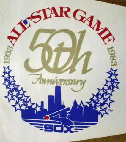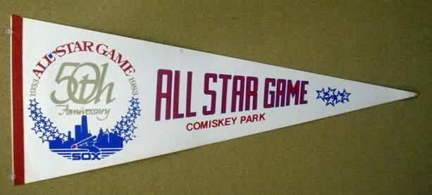 pennant. 50th ANNIVERSARY 1933-1983 ALL STAR GAME COMISKEY PARK. gold; red and blue on white. stiffer material. just shy of 30" long. minor wear to tip. unused. near mint. 20.00
