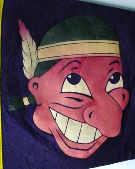 pennant. CLEVELAND INDIANS. White script lettering on purple soft felt, golden yellow border with matching tassels. tip is intact. Large colorful portrait of CHIEF WAHOO mascot. minor thumbtack stain on border strip. very minor moth damage on top edge near tip. early 1950's vintage. 29" long. colors are strong and bright. excellent plus or better. 75.00