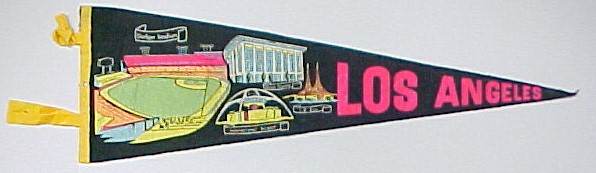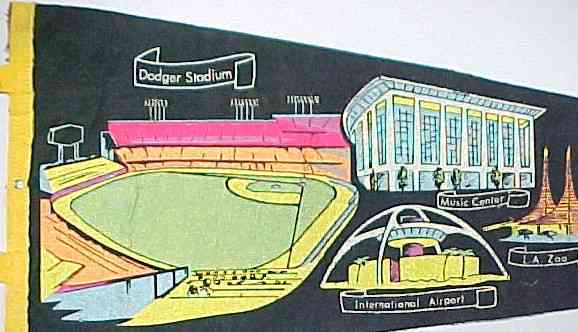 pennant. c.1960 DODGER STADIUM . 8.25" wide by 26.5" long - not counting the ties. Older, soft black felt pennant. Red lettering reads LOS ANGELES. Has full color illustrations of DODGER STADIUM, Music Center, International Airport, and L.A. Zoo. Large , multicolored shot of DODGER STADIUM. Has gold colored border strip with all 4 gold colored ties intact (note that he other ties are tied together). There is a punch hole in the center of the border strip. Tip of pennant is intact. No holes, no rips, no tears. Colors are strong. excellent plus to near mint. 39.50