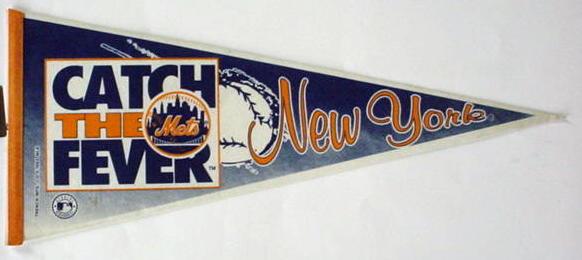 pennant. NEW YORK METS - CATCH THE FEVER. blue; orange and white. 1993. Made by Trench. full size. tip is intact. no pinholes. excellent plus. 12.00