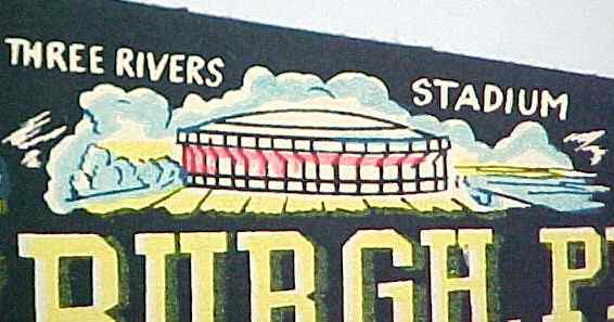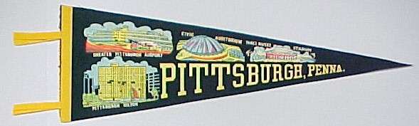 pennant. c.1970 PITTSBURGH THREE RIVERS Stadium pennant. 8 7/8" wide by 27 5/8" long - not counting the ties. Black felt pennant; yellow lettering reads PITTSBURGH; PENNA. Has full color illustrations of Pittsburgh Airport; Pittsburgh Hilton; Civic Auditorium and THREE RIVERS STADIUM (which was recently torn down). The stadium was home to the PIRATES and the STEELERS. Yellow border strip with all 4 yellow ties intact. The extreme tip of the pennant is squared off - as manufactured. There are no holes; no rips; no tears; no stains; no flaws. near mint to mint. 37.50