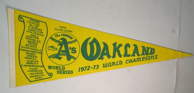 pennant. World Series 1972-73 OAKLAND A'S WORLD CHAMPIONS. green on yellow with white border. tip intact. pin holes in corners. scroll with list of players: Fosse; Tenace; Blue; Ringers; Hamilton; Hotzman; Holt; Hunter; Knowles; North; Odom; Bando; Campaneris; H. Washiongton; Haney;p Green; Maxvill; Kubiak; Abboptt; C. Washington; Alou; Lindblad; Jackson; Mangual; Rude; Mgr. Alvin Darki. approx. 30.5" long. excellent. 35.00