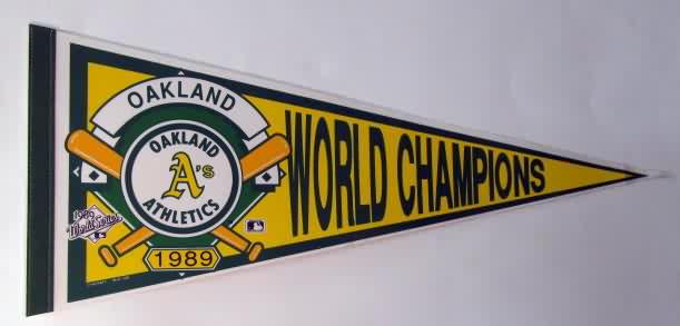 pennant. 1989 OAKLAND ATHLETICS WORLD CHAMPIONS. green/yellow/white. green border. tip intact. made by Wincraft. approx. 29.5" long. near mint. 22.00
