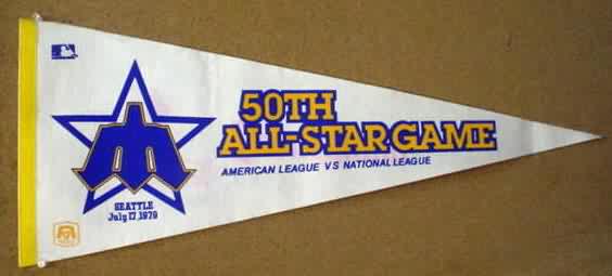 pennant. 50TH ALL-STAR GAME - SEATTLE '79. very large full color view of the Kingdom Stadium with mountains in background. to the right is the Seattle Mariners All-Star Game Logo on white background. golden yellow border strip. approx. 30" long. Never used. colors are bright and crisp. near mint to mint. 29.50