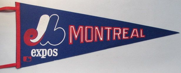 pennant. MONTREAL EXPOS. dark red and white on blue. red border. tip intact. pinholes in corners. approx. 30" long. 1970's. excellent plus or nicer. 21.00