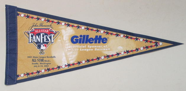 pennant. 2001 ALL-STAR FAN FEST. Seattle Washington. promotional from Gillette. colorful graphics on tan with dark blue border. 17.5" long. tip intact. excellent. 10.00
