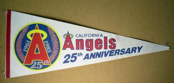 pennant. 1985 CALIFORNIA ANGELS 25th ANNIVERSARY 1961-1985. red/blue/silver/yellow on white. red border. as made - no tassels. tip damaged. pin holes in corners. displays decently. 14.00