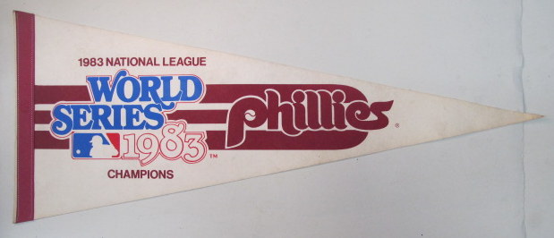 pennant. 1983 National League Champions PHILADELPHIA PHILLIES WORLD SERIES. maroon/blue/red on white. maroon border. tip intact. soiling near tip. approx. 30" long. excellent plus. 22.50